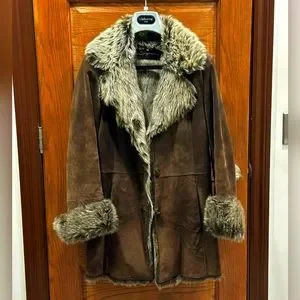 Small, faux fur, genuine leather winter coat. Bought in Germany, manufactured in Eastern Euruope. Brown with grey fur.