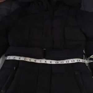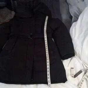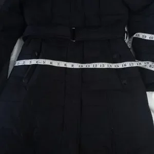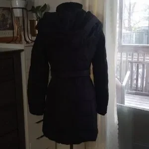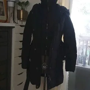 Warm winter coat adjustable belt keeps your hour glass shape even when bundled up in cold winters, two way zipper, storage pocket inside coat, deep pockets on outside of coat with snaps nice big hood, like new only wore it one season a handful of times. Again love this coat but it's too small on me now.