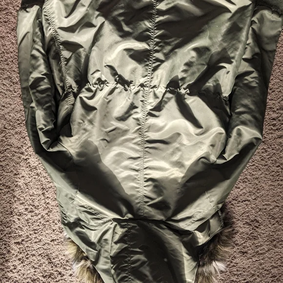 excellent condition, dark green, fits size 10 to 16, insert is red vest and is removable to wear as long vest or lighter green jacket shell. very warm and comfy