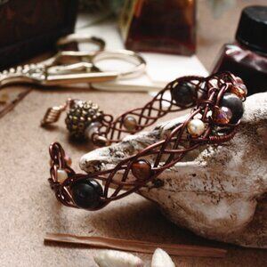 Handmade wire-work cuff style bracelet. Brand new; originally from my Etsy shop. Materials include: Coloured artistic wire in a rich brown-maroon, brass & copper wire, Swarovski crystal faux pearls, chinese crystal, resin & glass pearl beads.