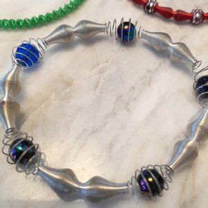 This unique collection has 3 wire and bead bracelets and one blue stone and bead wrap bracelet. All are in excellent condition. Please see photos for more details.