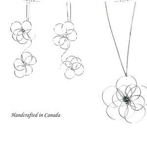 1. A pair of handmade wire flower earrings. Long dangle stainless steel earrings with whimsical flowers.