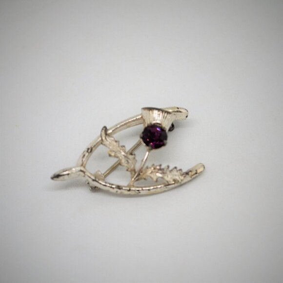 Pretty vintage silver tone brooch with a rose entwined in a wishbone. A purple stone (I don't know what kind) punctuates the silver giving this piece some sparkle. Measures 1 1/8" x 5/8". It is marked WRS STERLING SILVER on the back, but there is a little wear to the surface of the metal that suggests it is not actually sterling, or may be plated.