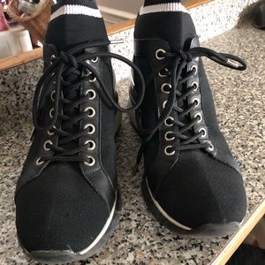 Cute black ankle booties/ slip ons but have laces so you can adjust tightness/elastic sock top built in/ leather and stretchy material/ not sized but they are an 8