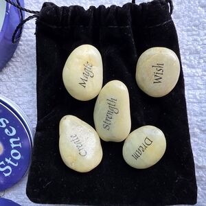 Set of wishing stones in a purple container. Features words like 'create' and 'wish'.