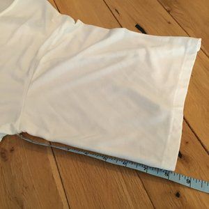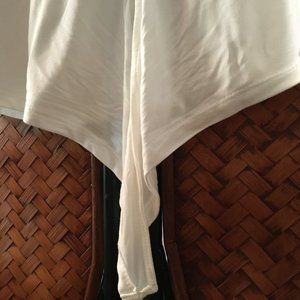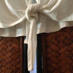 Excellent preowned condition, white button down shirt with tie up feature by Wishlist. This shirt is adorable and has a lot of good things going for it. Lightweight, comfortable and made of sustainable bamboo fabric, it's the perfect addition to a summer wardrobe. The sleeves are not too long and not too short. The buttons are delicate and draw just the right amount of attention to them. It's tagged as a small, but has a baggy, oversized fit (please see measurements below for details).
