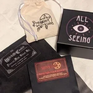 Ritual kit bundle: featuring black protection sigil stones with gold symbols, intuition spell bottle kit, protective floor wash and "peace of mind" ritual kit. Witch Casket exclusives. Great for altar work and spellcraft.