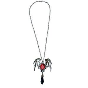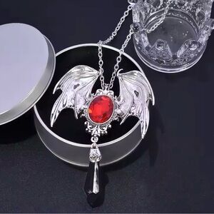 The silver-tone pendant features detailed engraved bat wings wrapped around a striking red oval crystal, accented with a dangling black pendant for an extra mysterious touch.