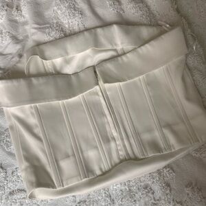 “The Carla Corset is a fitted bodice that contours the body with its boning and strapless square neckline. The corset is slightly cropped making it perfect to wear with a statement pair of pants.”