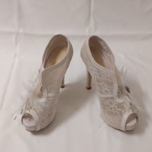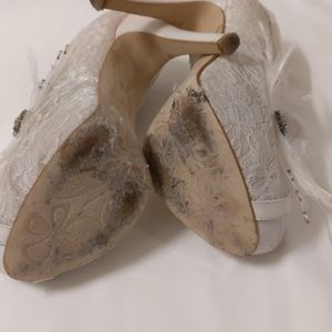 Used once for wedding. They have a nice details of feathers. Heel is 11.5cm and the platform is 3cm high.