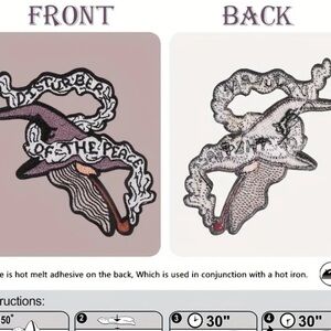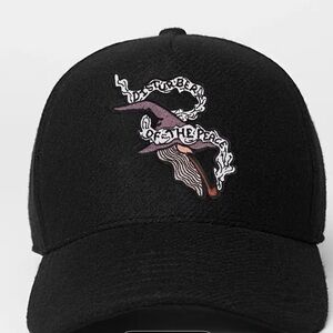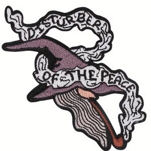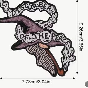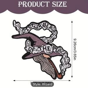 Unique wizard hat patch with intricate embroidery. Features text design and mystical elements.