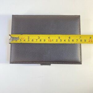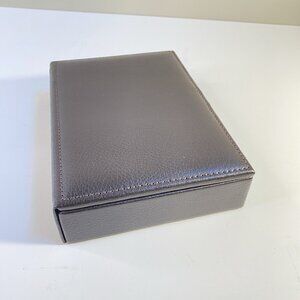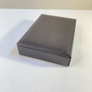 This WOLF Est. 1834 jewelry box is crafted in brown leather with a smooth, structured exterior and a secure snap closure. Inside, the soft suede-like lining features multiple divided compartments designed to store and organize rings, earrings, bracelets, and small accessories. A refined piece from WOLF, established in 1834, it combines timeless design with functionality. Light surface wear on the box exterior consistent with gentle handling, but overall in excellent condition and ready for use. Includes the original branded box (small tear on bottom corner) making it perfect for gifting or personal use.
