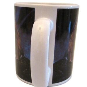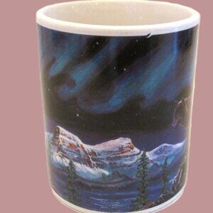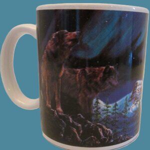 Ceramic wildlife mug of wolves, outback mountains & ice and bodies of ocean with dogs/wolves howling at this time of night. A picturesque picture of nature and wildlife in its beauty. A mug in in wonderful condition. Measures: 3 3/4" (9.5cm) H x 3 1/4" (8.5cm)W across the lip of mug.
