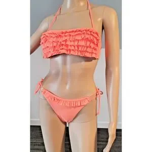Woman Medium Orange Ruffle Bikini Set Top/ Low Rise Bottom Removable Straps