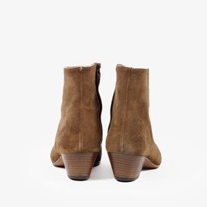 Crafted from suede in tobacco brown, these zip ankle boots feature an almond toe with a tapered stacked leather heel, leather-lined insoles and lining, and a leather outsole. The side zipper allows these boots to slip in with ease.