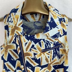 Blue yellow, sleeveless, collar, asymmetrical zipper, 2 faux pockets on front, adjustable snaps at waist, abstract design,EUC, neck to hem 20”, armpit to armpit 20”, small