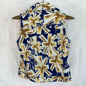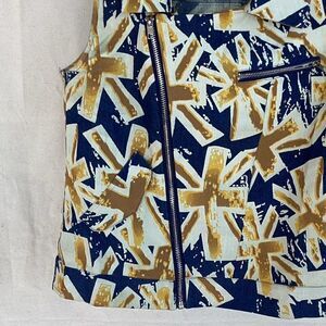 Blue yellow, sleeveless, collar, asymmetrical zipper, 2 faux pockets on front, adjustable snaps at waist, abstract design,EUC, neck to hem 20”, armpit to armpit 20”, small