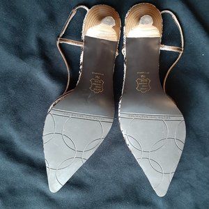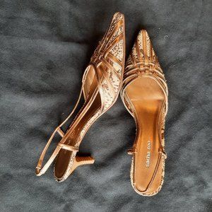 Worn only twice for weddings. Like new. Color is Beige / Beige Metal. 2 1/2 inch heels. Brand is Sacha Too. Ships from Toronto, Canada.