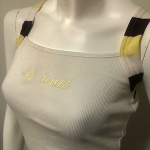 Vintage Authentic G-Unit tank top, thick straps with brown and yellow stripes. Yellow G Unit logo embroidered stitching in yellow on the front. Size XS but may also fit as size S.