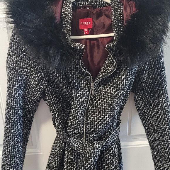 Worn once or twice, beautiful 3/4 length jacket can be for 3 seasons. Black faux fur hood
