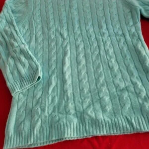 This sweater is pale Blue showing more green in pics it's very soft combination knit feels like nylon Angora