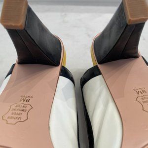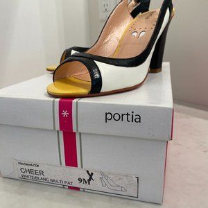 Portia make, woman's, size 9 medium shoes. They are in excellent condition with 1 small scuff on the outside toe as seen in the photo I bought these cute shoes new and wore them once. White with bright yellow and black accents. Leather with patent sheen.