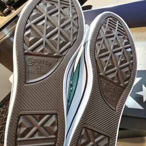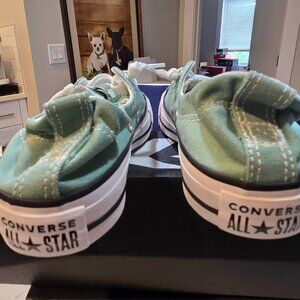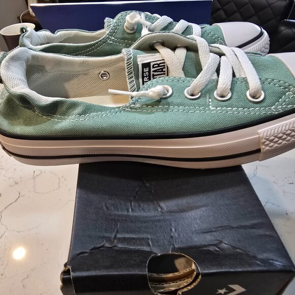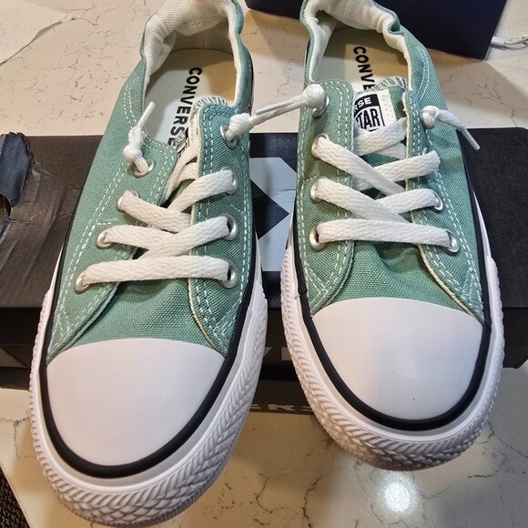 The Woman's Shoes Converse Chuck Taylor All Star Shoreline Slip-On Sneaker in size 7.5 is a casual and comfortable option for women. Made with canvas fabric and featuring a rubber outsole, these sneakers are perfect for the summer, fall, and spring seasons. The slip-on style and low-top shoe shaft make them easy to wear, while the green and white color scheme with logo accents add a touch of style. With a standard shoe width and a durable rubber cleat, these athletic shoes from Converse are an essential addition to any woman's wardrobe.