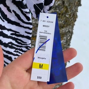 Woman's top with cold shoulder sleeves. Nygard brand with original tags ($59).Size medium. Black and white animal print with colourful floral pattern.