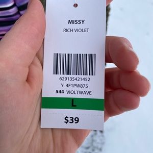 Woman's top, Size Large. TanJay brand with original tag ($39). Purple, blue and black textured ribbed design, 3/4 sleeve.