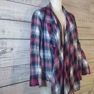Womans Top sz S/P Pink Purple Black Plaid Open Waterfall Front Long Sleeve