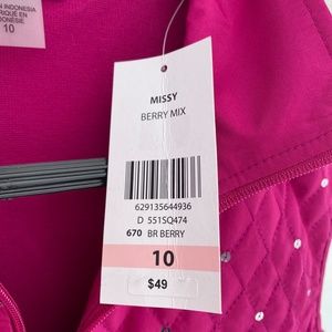 Woman's vest, Alia brand. Size 10 with original tag ($49). Fuchsia color, quilted front with silver sequin accents. stand collar and front zipper.