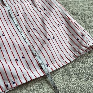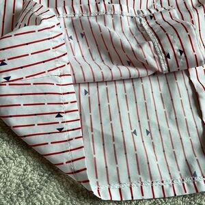 Beautiful white blouse with red stripes, perfect for adding a touch of retro charm to any outfit! Although there is a faint stain, the blouse is in overall good used condition and the price reflects this.