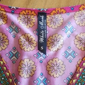 This dress is a short but beautiful polyester and spandex material summer dress. 3/4 length sleeve, perfect for the cold office shoulder to shoulder it measures 14 inches. Arm pit to arm pit its 15 inches. Shoulder to bottom hem is 32 inches