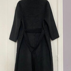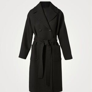 Women Black 100% Wool Double Breasted Button Belted Long Coat Trench Wool Coat