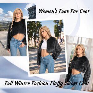Women Black Cropped Fur Coat for Faux Furry Long Sleeve Cropped Fluffy Jacket