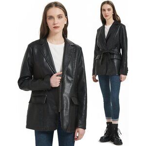 🆕 Women Black Faux Leather Blazer Jackets Spring Fashion Vegan Button Down Coat