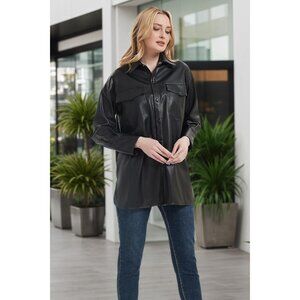 🆕 Women Black Faux Leather Jacket Loose Fit Spring Fall Casual Lapel Shirts