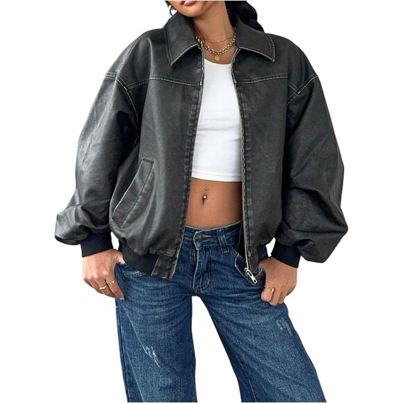 Design: Over sized, long sleeves, faux leather jacket, retro zipper motorcycle jacket, Y 2 K fashion, trendy coat