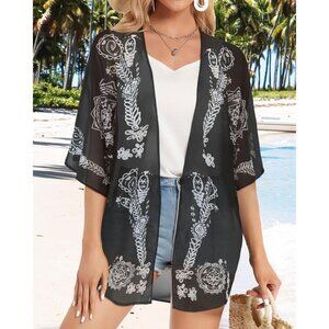 🆕Women Black Floral Kimono Cardigan Beach Cover-up Casual Jacket Polyester