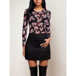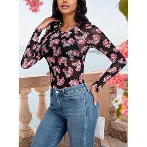 🆕Women Black Floral Mesh Top Polyester Crew Neck Long Sleeve Sexy See Through