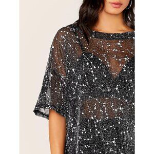 🆕 Women Black Glitter Sheer Tops Mesh Tee Short Sleeve Blouse Through T Shirts