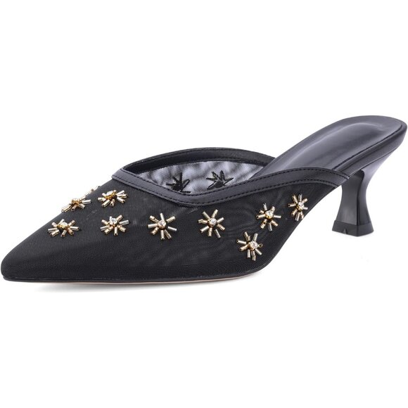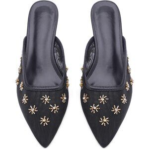 🆕Women Black Kitten Heel Mules Flower Decor Mesh Pointed Toe Low Heel Pumps