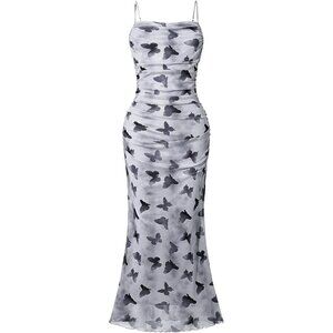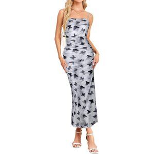🆕 Women Black Mesh Sexy Cami Long Dresses Floral Slip Maxi RuchedSummer Bodycon