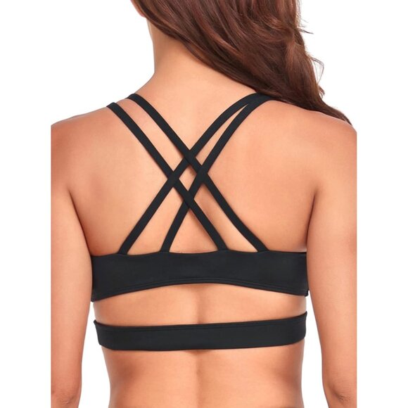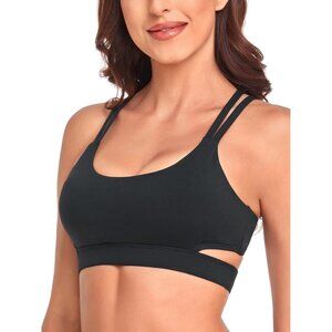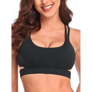 🆕Women Black Polyamide Sport Bra Scoop Neck Strappy Cutout Fitness Workout Top