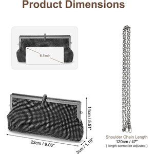 [Capable]: The Clutch Purse Size(LxWxH) is 23 x 3 x 14 cm / 9.06 x 1.18 x 5.51 inches, lightweight at only 0.5 pound. The Clutch purse material is PU fabric and crystal rhinestone, Its color is Black, Shoulder strap length is 120 cm / 47 inch. The evening bag is enough to hold the most needed items, such as makeup brushes, mobile phones, cards, money, car keys, and small wallets, ensuring you are prepared for any occasion.