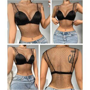 🆕Women Black Polyester Glitter Tank Top Sexy Mesh Rhinestone Hollow Crop Top