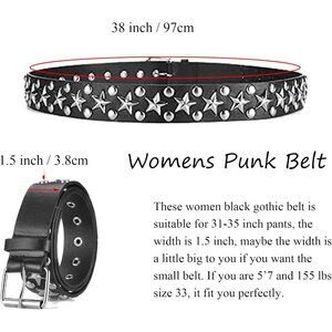 Suitable 31-35 inch Waist: The women y 2 k belt with 1.5 inch width, whole length 38 inch, but suitable for 31-35 inch pants, if you are 5’6 1/2, 188 lbs and between a 12 and 14, this girl stud belt is too small for you, if you are 5’7 and 155 lbs size 33, this black y 2 k belt fit you perfectly.