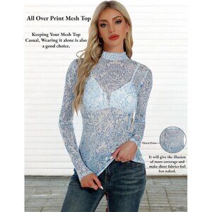 Women Blue Floral Long Sleeve Mock Neck Fitted Sexy See Through Mesh Tops