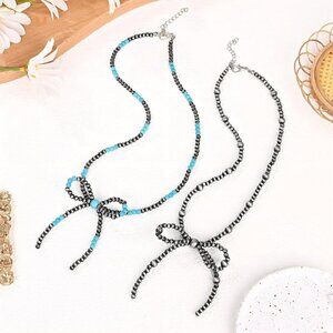 【Navajo Pearl Bow Necklace】:Featuring a unique Navajo Pearl Bow design in a classy grey color, this necklace effortlessly combines traditional western aesthetics with modern trends, making it a perfect statement piece for any outfit