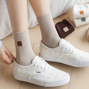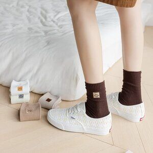 🆕 Women Brown Aesthetic Crew Socks Cute Smiling Face Embroidery Cotton Students